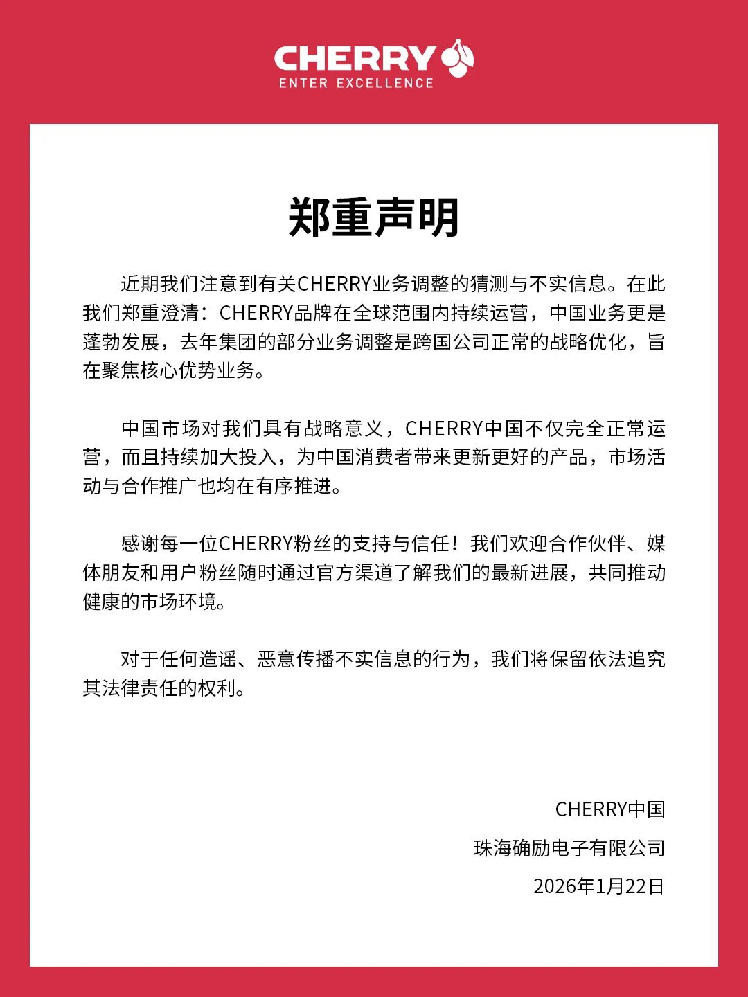 近期,我们注意到有关CHERRY业务调整的猜测与不实信息。在此我们郑重澄清:
